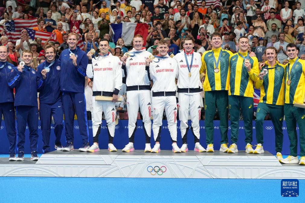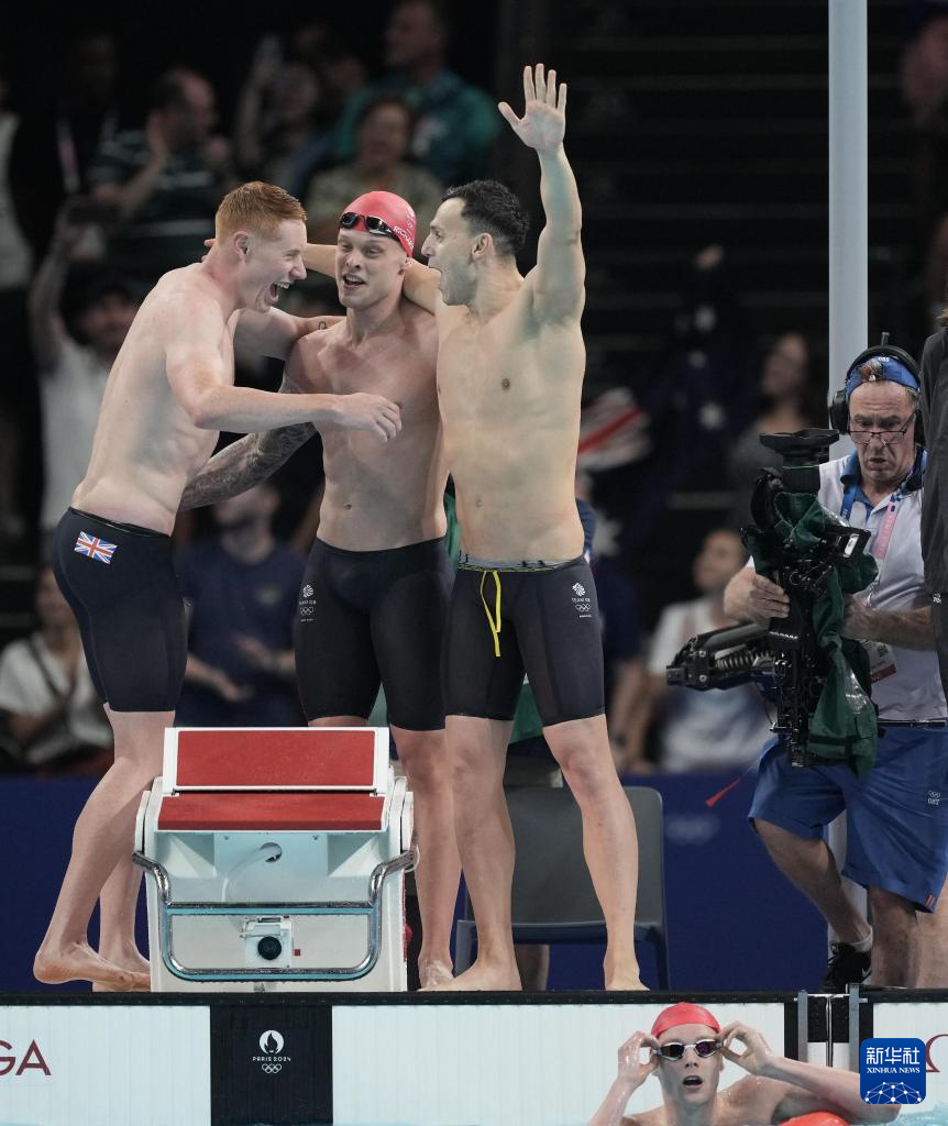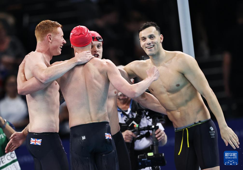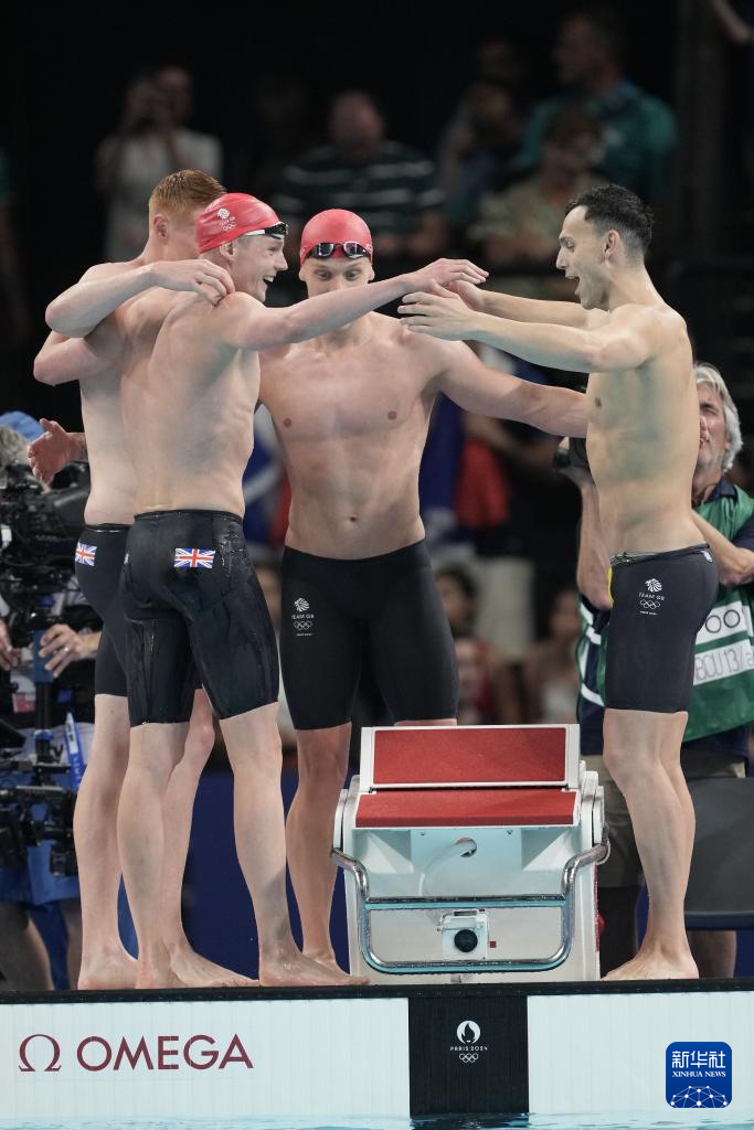 当日,巴黎奥运会游泳男子4x200米自由泳接力决赛在拉德芳斯体育馆举行,英国队夺得冠军,美国队、澳大利亚队分获亚军、季军。