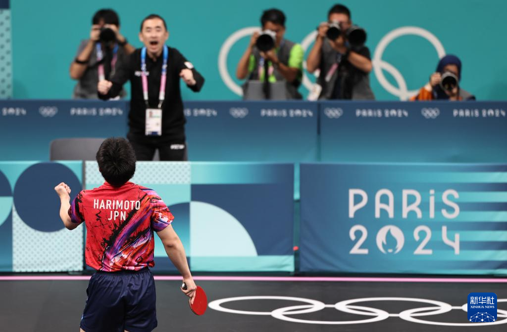 7月31日,张本智和(上)在比赛获胜后庆祝。新华社记者 王东震 摄