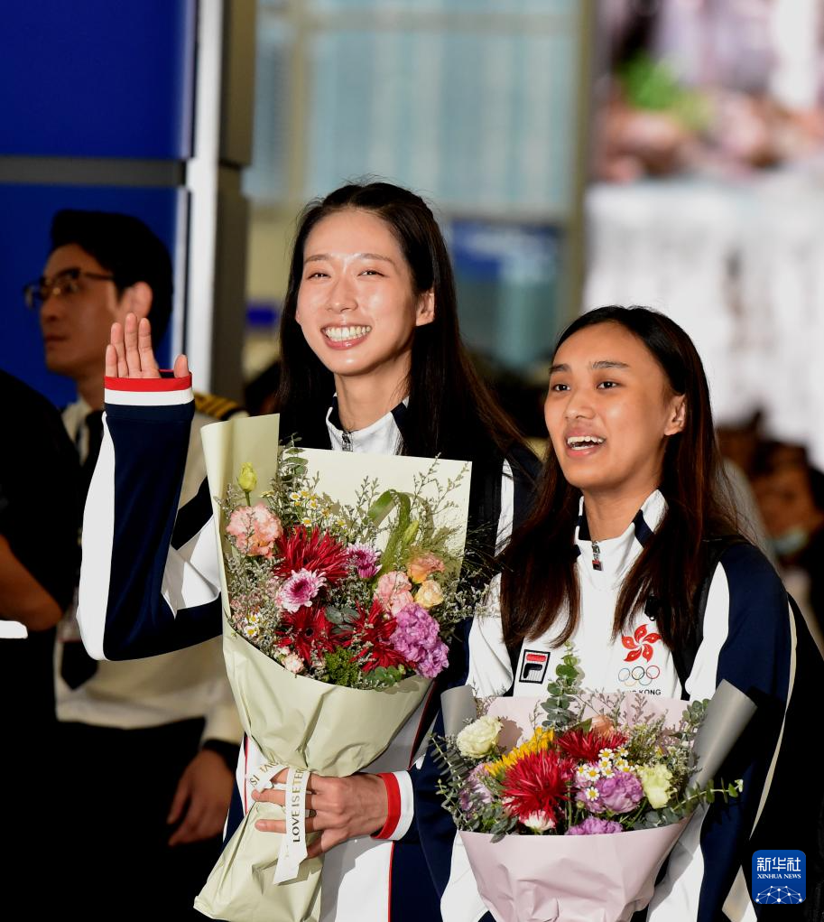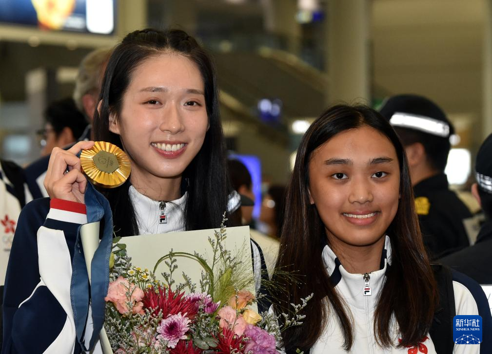 8月1日,中国香港女子击剑队运动员江旻憓(左)和队友陈诺思抵达香港。江旻憓夺得巴黎奥运会击剑女子个人重剑金牌。新华社记者 卢炳辉 摄