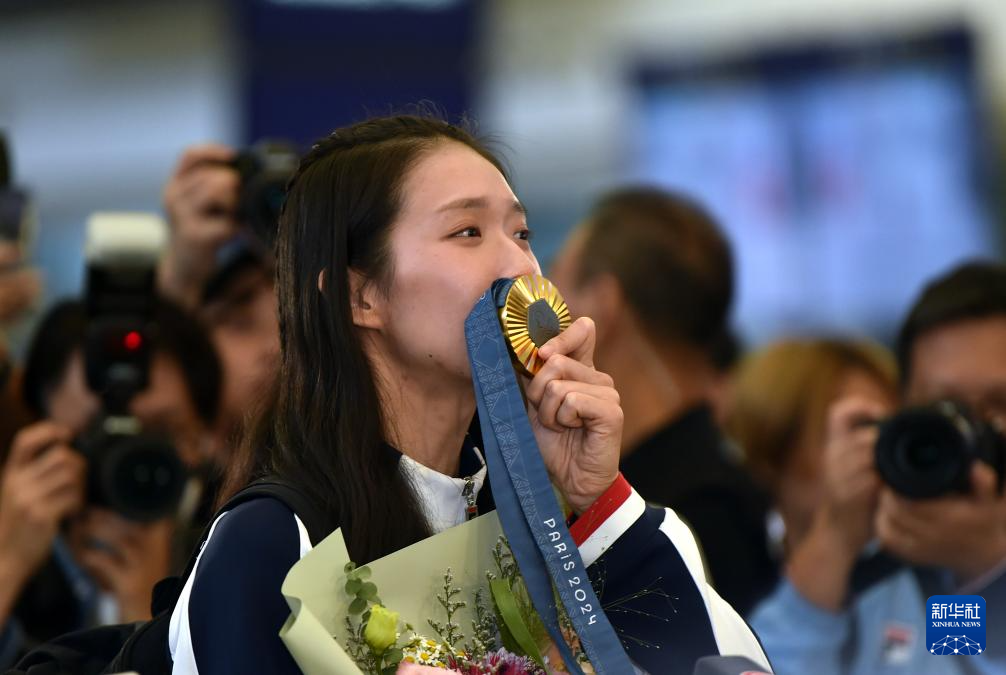 8月1日,中国香港女子击剑队运动员江旻憓在机场亲吻金牌。江旻憓夺得巴黎奥运会击剑女子个人重剑金牌。新华社记者 卢炳辉 摄