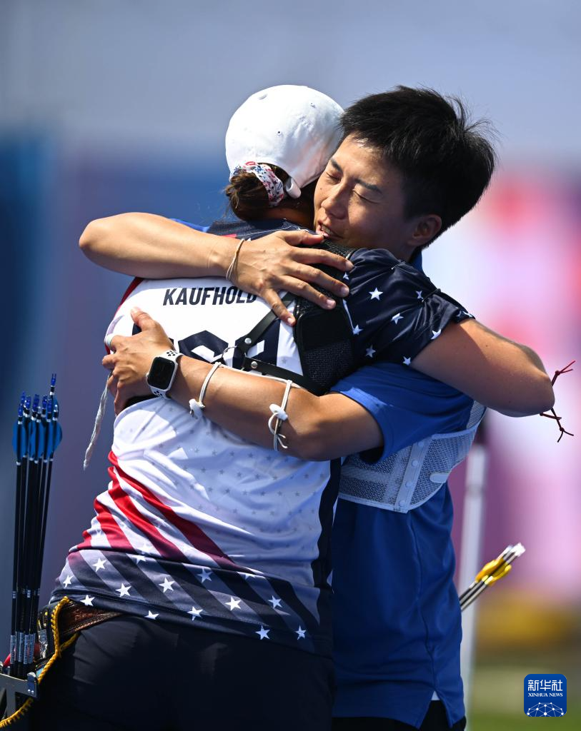 8月1日,中国台北选手雷千莹(右)在女子1/16淘汰赛后和美国选手考夫霍尔德拥抱。雷千莹战胜考夫霍尔德。
