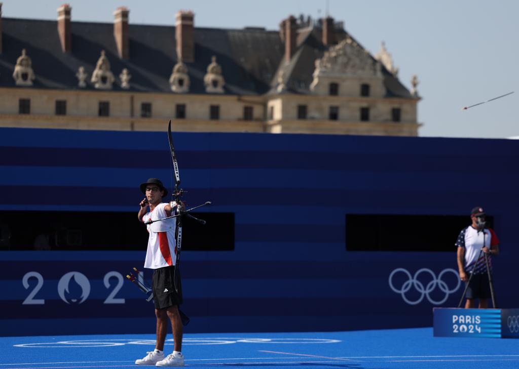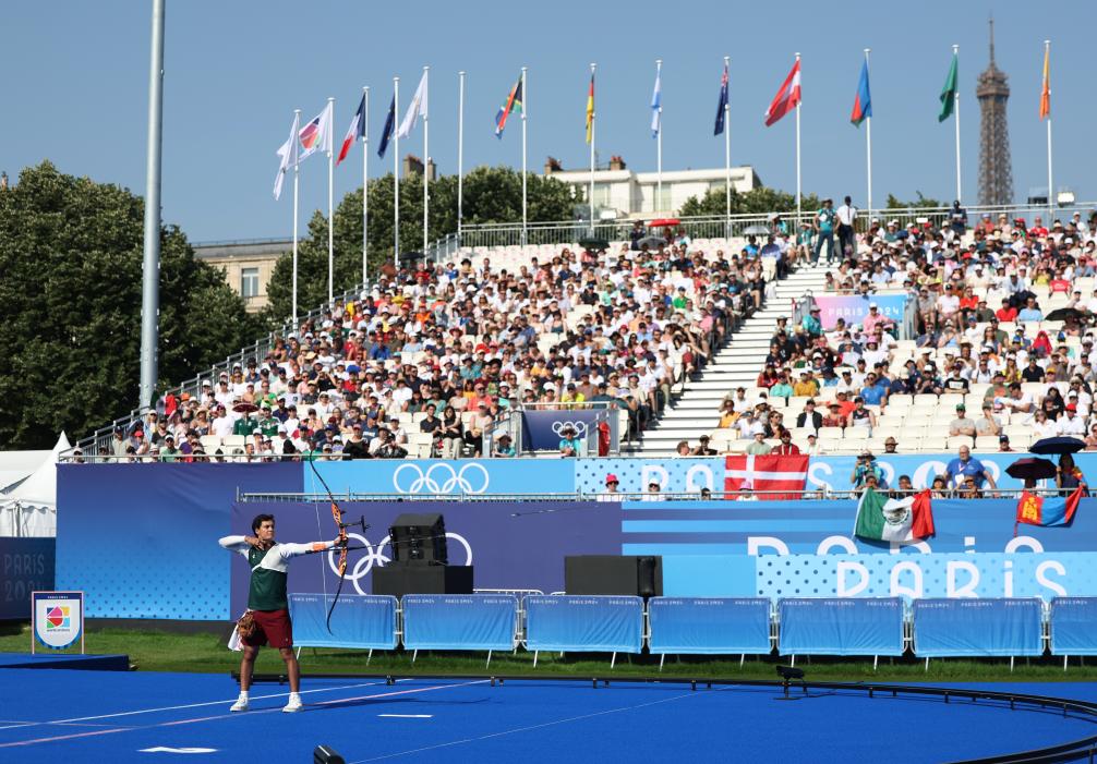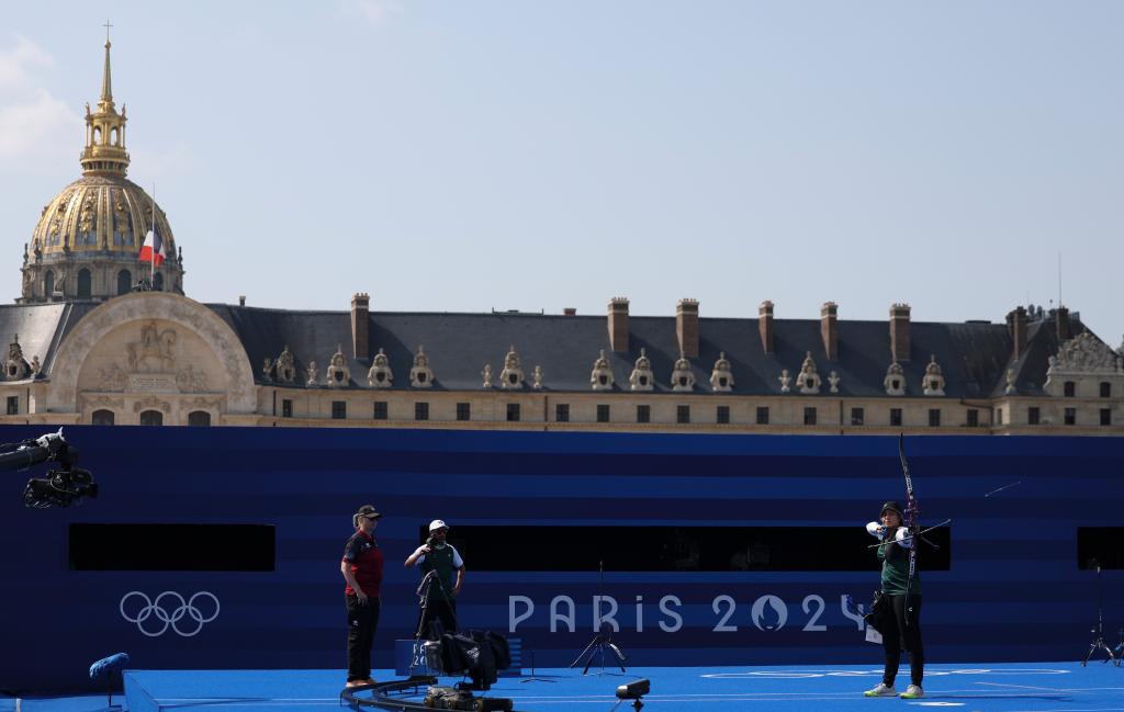 当日,巴黎奥运会射箭项目淘汰赛在巴黎荣军院继续进行。