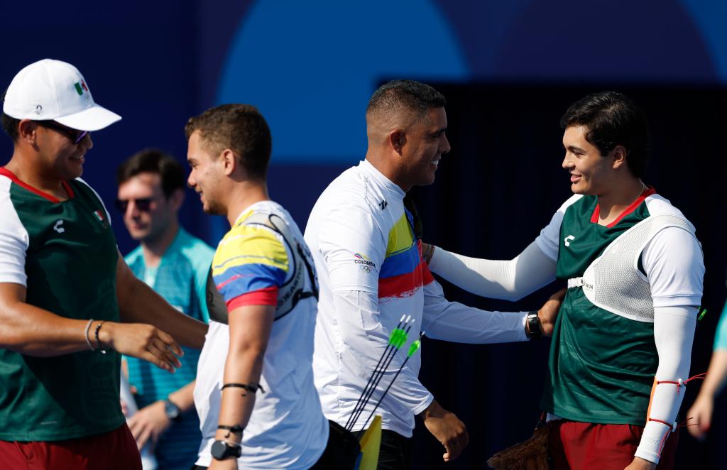 8月1日,墨西哥选手格兰德(右一)和哥伦比亚选手恩里克斯(右二)在男子1/16淘汰赛后。格兰德战胜恩里克斯。