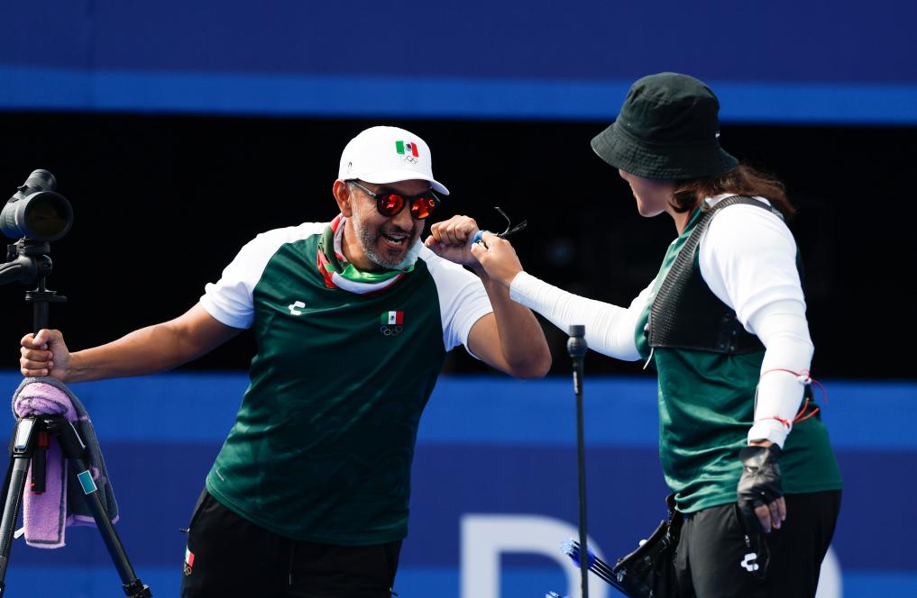 8月1日,墨西哥选手巴伦西亚(右)在女子1/32淘汰赛中和教练庆祝。她战胜美国选手穆西诺。