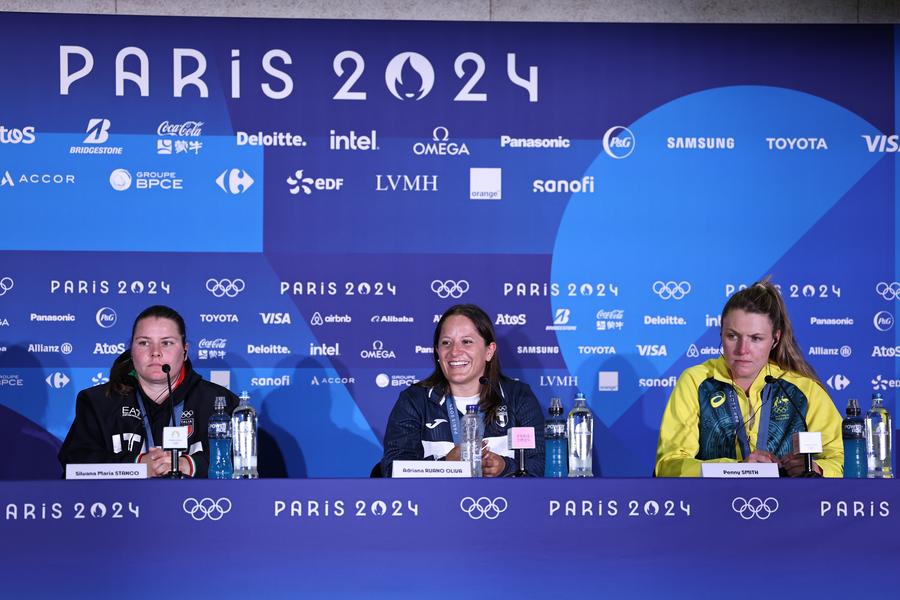 ↑7月31日,冠军危地马拉选手鲁阿诺·奥利瓦(中)、亚军意大利选手斯坦科(左)和季军澳大利亚选手史密斯在赛后新闻发布会上。新华社记者 张帆 摄
