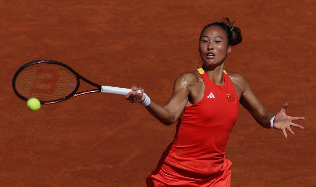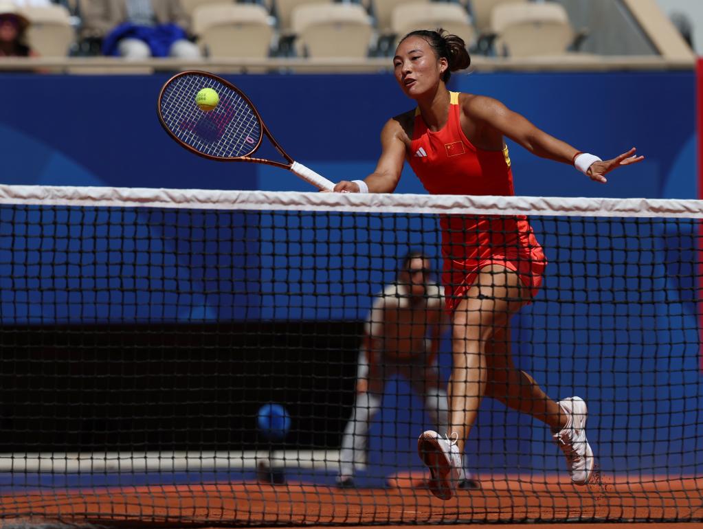 7月31日,郑钦文在比赛中回球。新华社记者 高静 摄