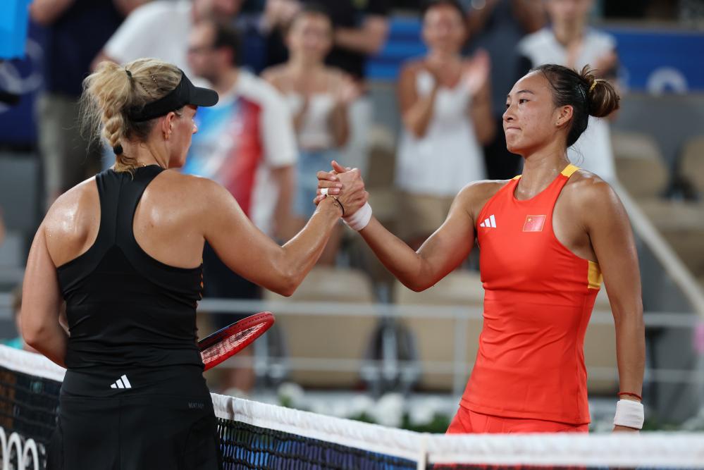 7月31日,郑钦文(右)和科贝尔在赛后握手致意。新华社记者 高静 摄
