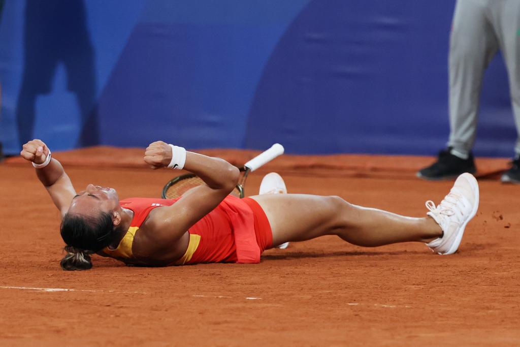 郑钦文在赢球的一瞬间扔掉了拍子,躺在了罗兰·加洛斯中心球场的红土上。再度起身,她一边向观众致意,一边用手擦拭着眼泪。