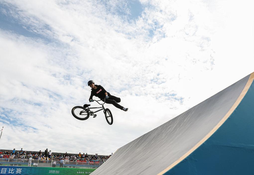 2021年9月19日,邓雅文在第十四届全运会女子小轮车自由式公园赛比赛中。新华社记者 吴壮 摄