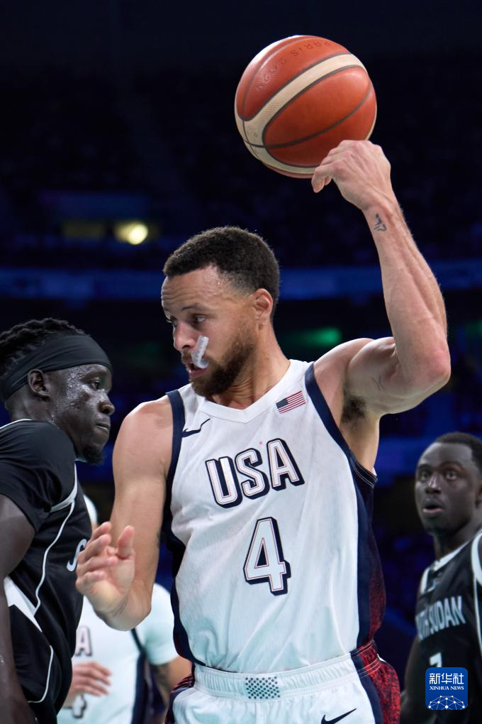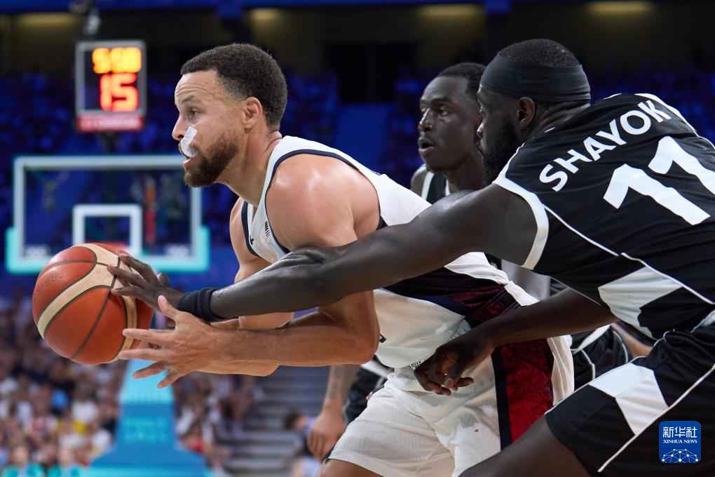 7月31日,美国队球员库里(左)与南苏丹队球员夏约克在比赛中拼抢。新华社记者 孟鼎博 摄