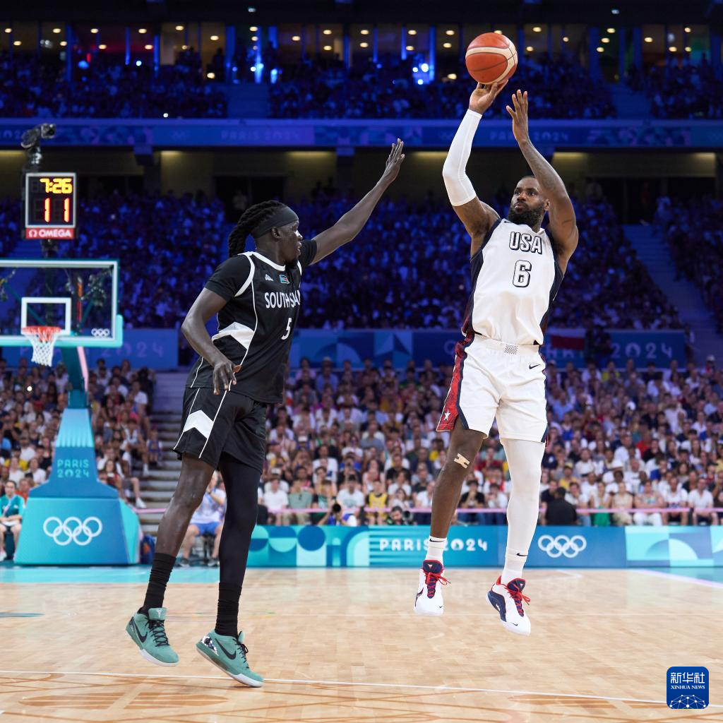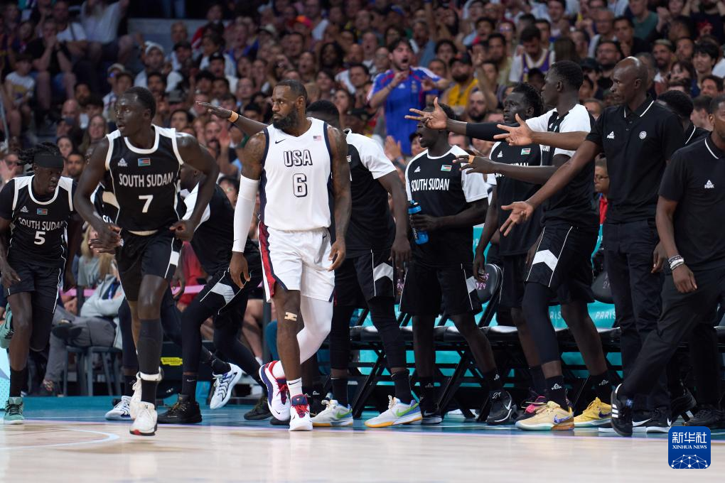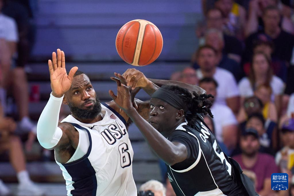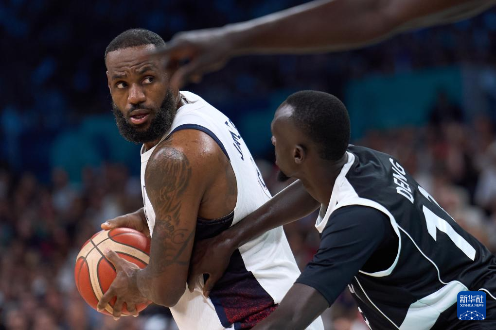 7月31日,美国队球员詹姆斯(左)与南苏丹队球员邓在比赛中。新华社记者 孟鼎博 摄