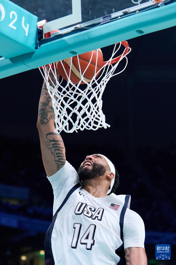 7月31日,美国队球员戴维斯在比赛中扣篮。新华社记者 孟鼎博 摄