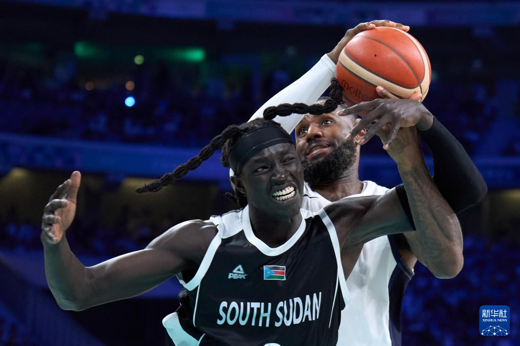 7月31日,美国队球员詹姆斯(左)与南苏丹队球员欧莫特在比赛中拼抢。新华社记者 孟鼎博 摄