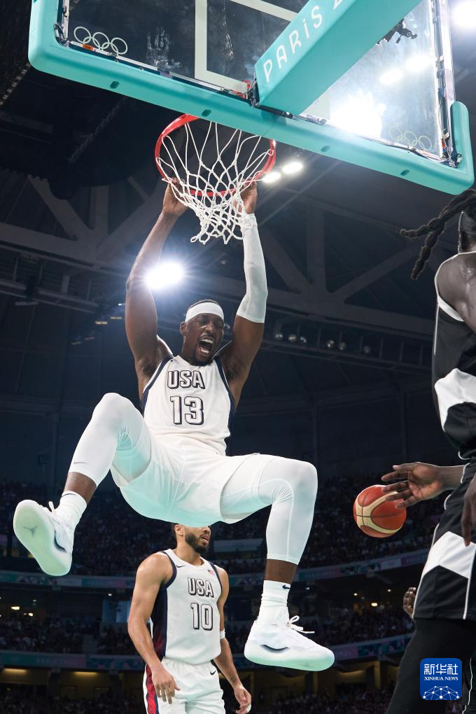7月31日,美国队球员阿德巴约在比赛中扣篮。新华社记者 孟鼎博 摄