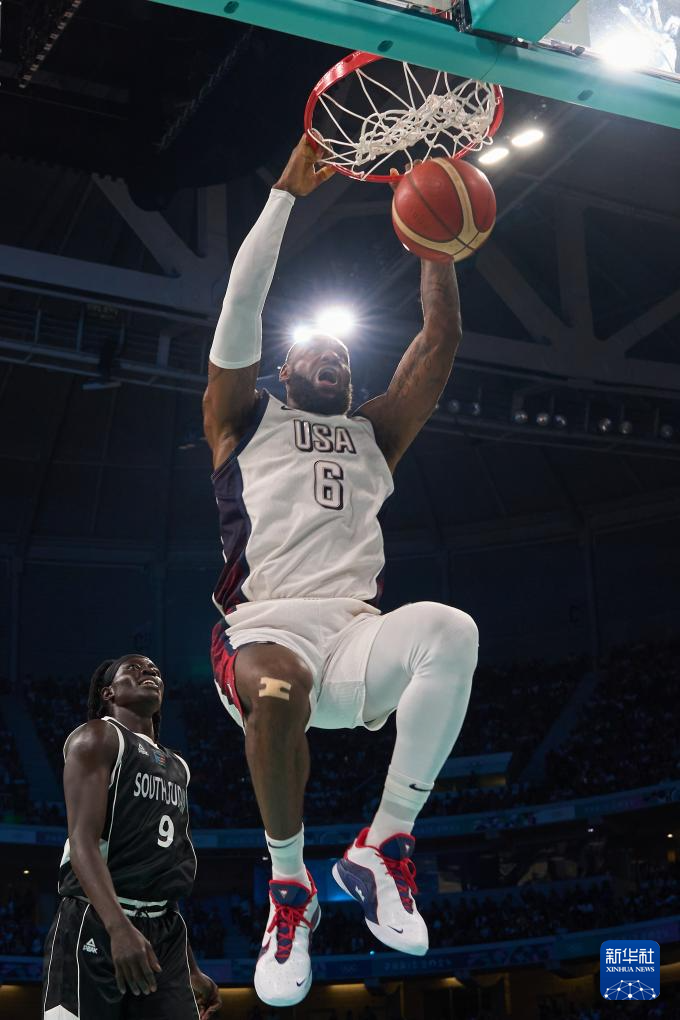 7月31日,美国队球员詹姆斯(右)在比赛中扣篮。新华社记者 孟鼎博 摄