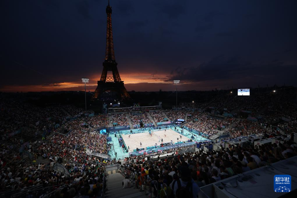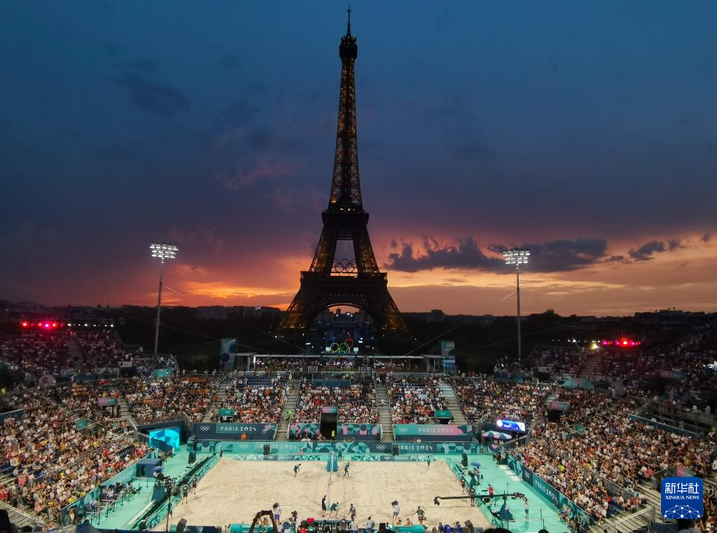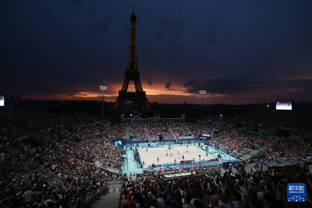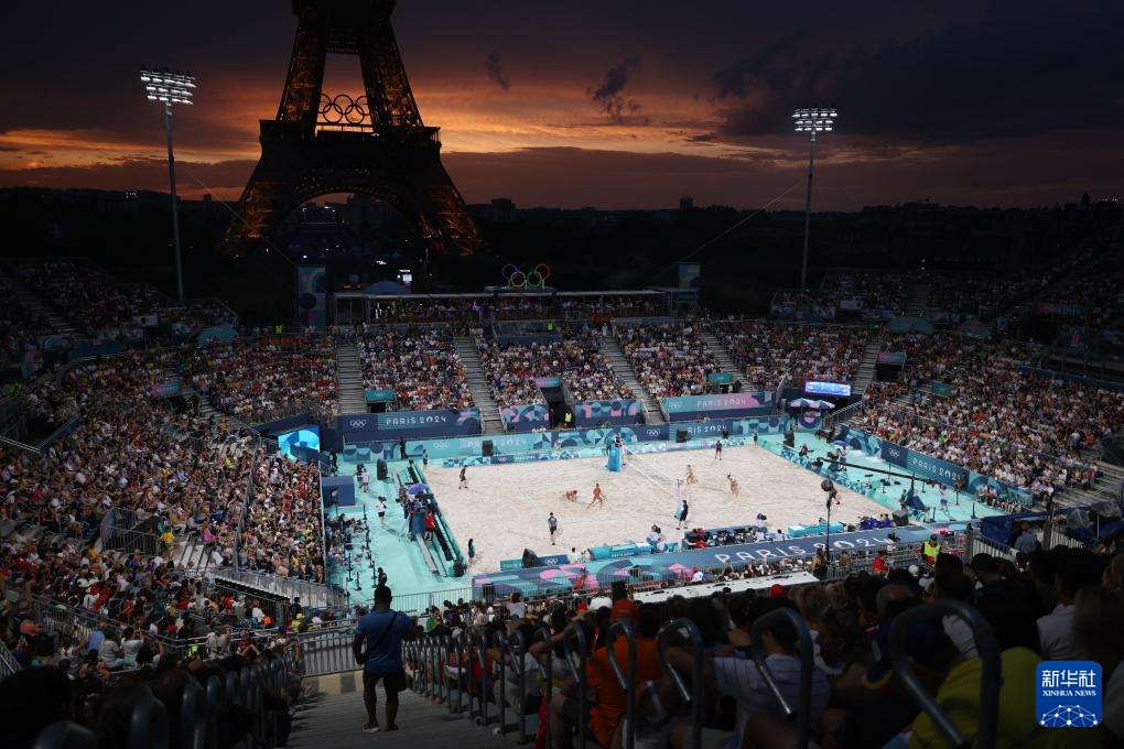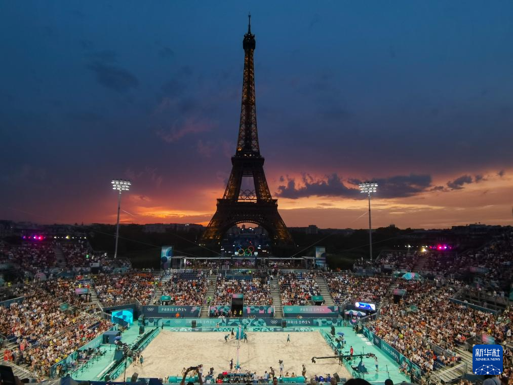 当日,巴黎奥运会沙滩排球女子小组赛在埃菲尔铁塔体育场举行,阵雨后的巴黎迎来绚丽晚霞。