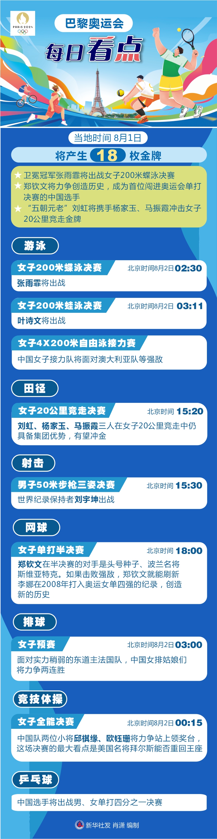 新华社巴黎7月31日电(记者王恒志、张泽伟)巴黎奥运会8月1日将产生18枚金牌,卫冕冠军张雨霏将出战女子200米蝶泳决赛,郑钦文将力争创造历史,成为首位闯进奥运会单打决赛的中国选手。田径项目将开赛,“五朝元老”刘虹将携手杨家玉、马振霞冲击女子20公里竞走金牌。