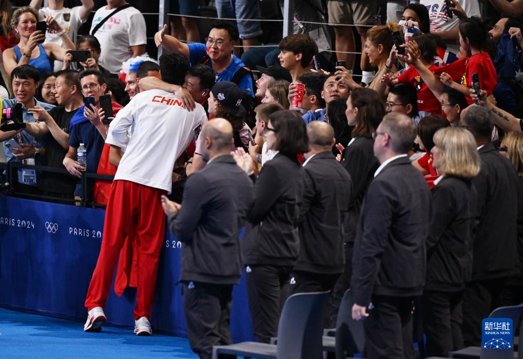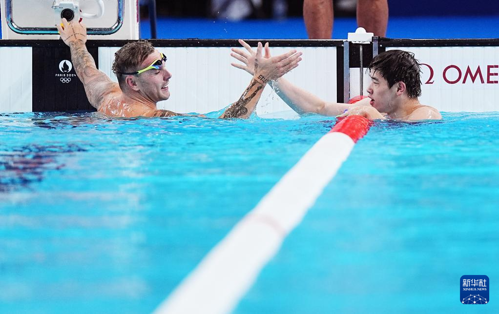 7月31日,中国选手潘展乐(右)接受外国选手的祝贺。新华社记者 王毓国 摄