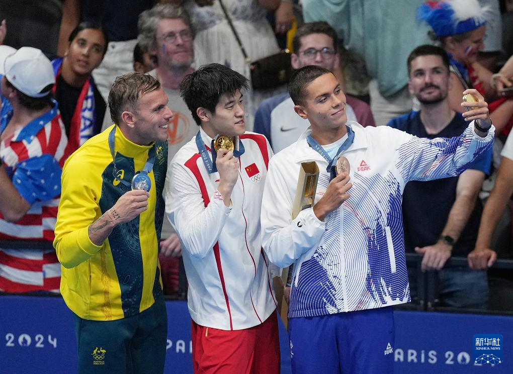 7月31日,冠军中国选手潘展乐(中)、亚军澳大利亚选手查默斯(左)与季军罗马尼亚选手波波维奇在颁奖仪式后。新华社记者 雒圆 摄