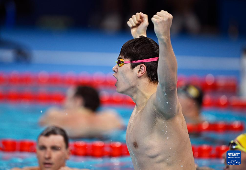 7月31日,中国选手潘展乐(前)庆祝夺冠。新华社记者 王毓国 摄