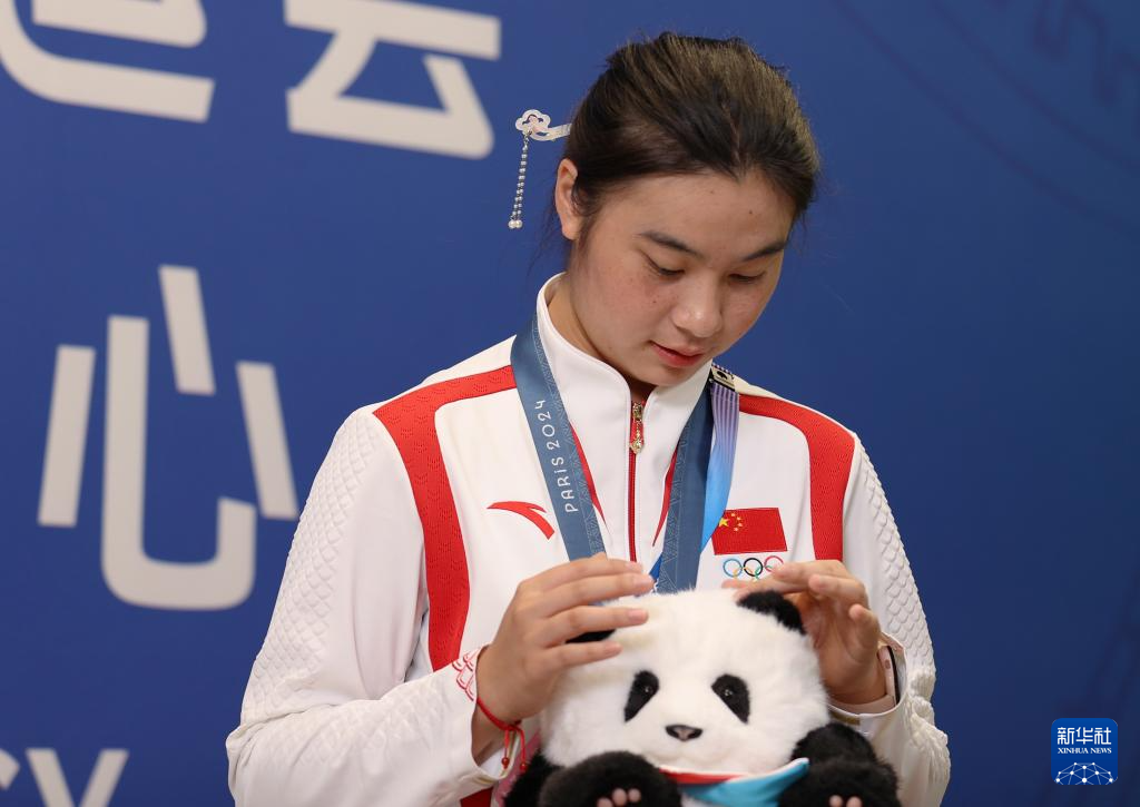 7月31日,邓雅文在接受新华社记者专访时展示自己获得的金牌。新华社记者 杜潇逸 摄