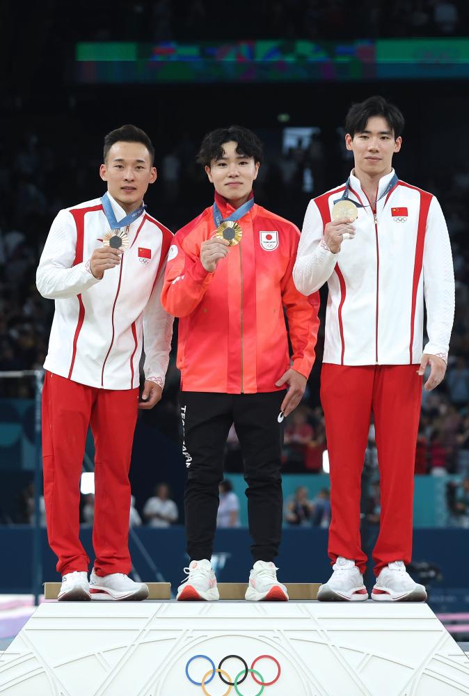 新华社巴黎7月31日电(记者李典、卢羡婷、张骁、焦敏)一套难度高达6.5的单杠动作,14.663分。张博恒在巴黎奥运会体操男子个人全能决赛中的成绩,最终定格在86.599分,他和队友肖若腾分别获得银牌和铜牌,冠军被日本选手冈慎之助夺得。