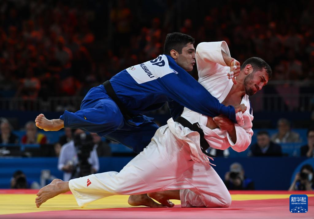 7月31日,格鲁吉亚选手别考里(右)和西班牙选手莫萨基利什维利在比赛中。别考里战胜莫萨基利什维利,晋级决赛。新华社记者 武巍 摄