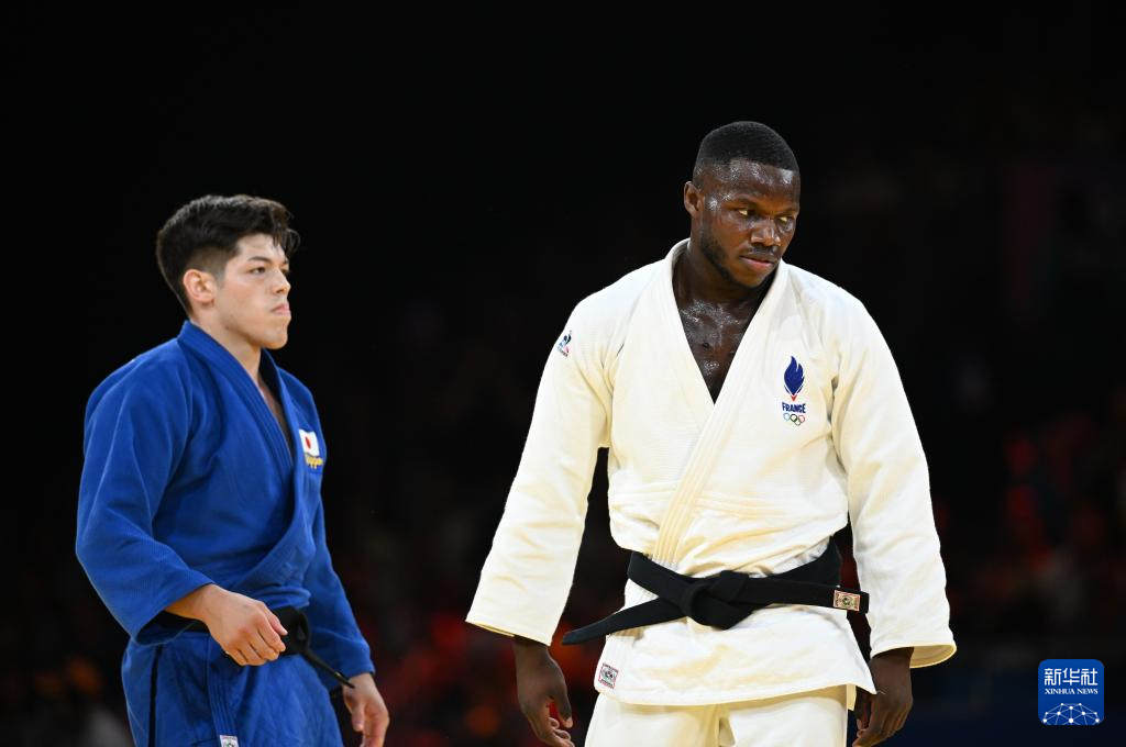 7月31日,日本选手村尾三四郎(左)与法国选手汉布在比赛中。村尾三四郎战胜汉布,晋级决赛。新华社记者 武巍 摄