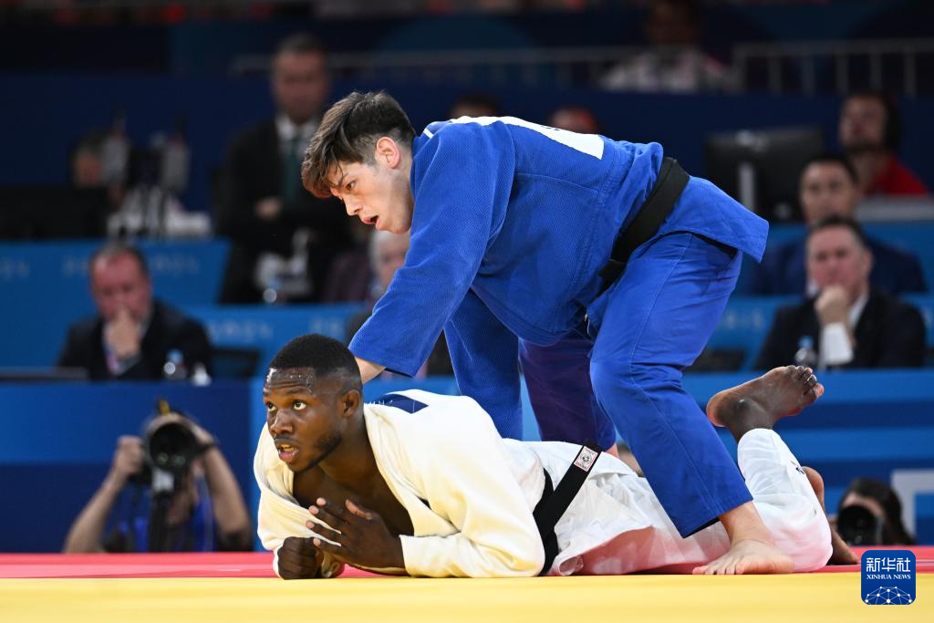 7月31日,日本选手村尾三四郎(上)与法国选手汉布在比赛中。村尾三四郎战胜汉布,晋级决赛。新华社记者 武巍 摄