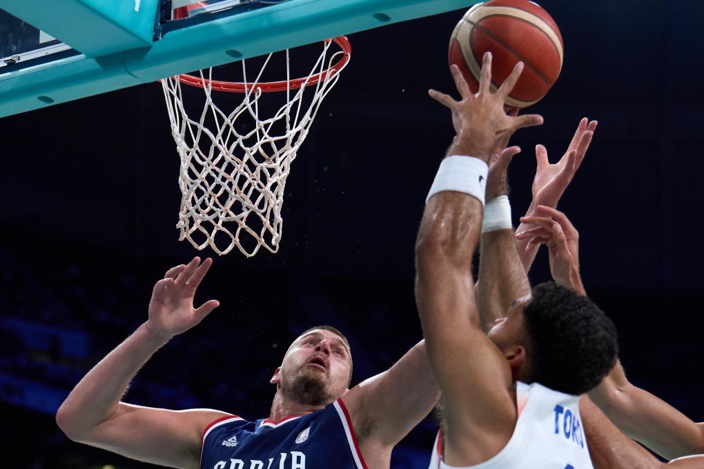 7月31日,塞尔维亚队球员约基奇(左)与波多黎各队球员多罗在比赛中拼抢。新华社记者 孟鼎博 摄