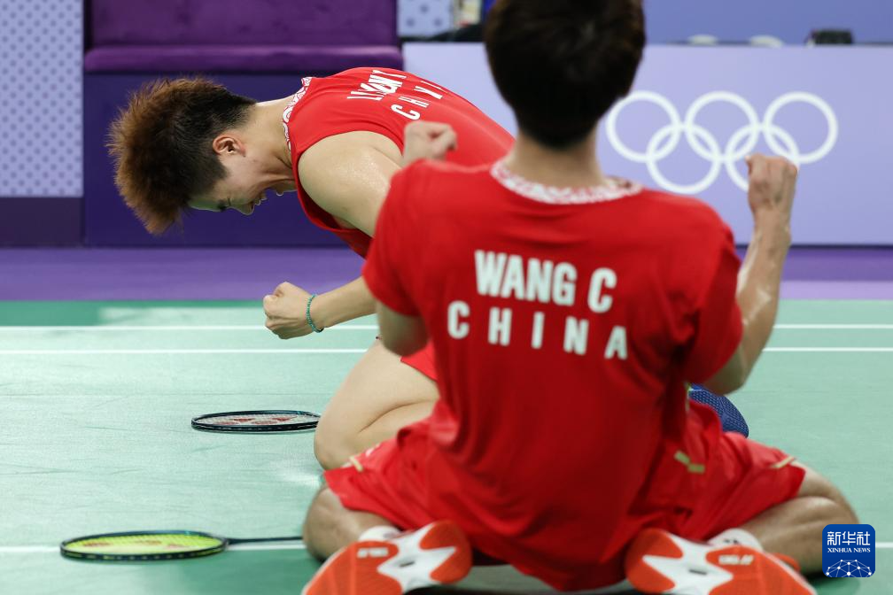 8月1日,中国组合梁伟铿(左)/王昶庆祝比赛获胜。新华社记者 陈斌 摄