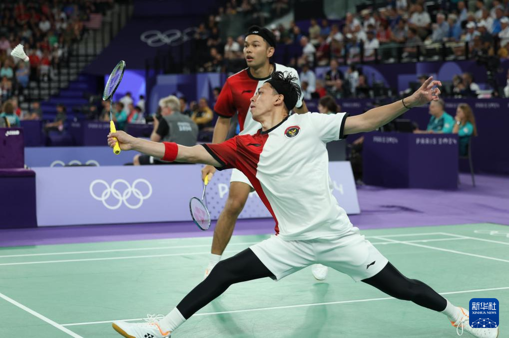 8月1日,印度尼西亚队组合阿尔菲安(前)/阿迪安托在比赛中。新华社记者 陈斌 摄