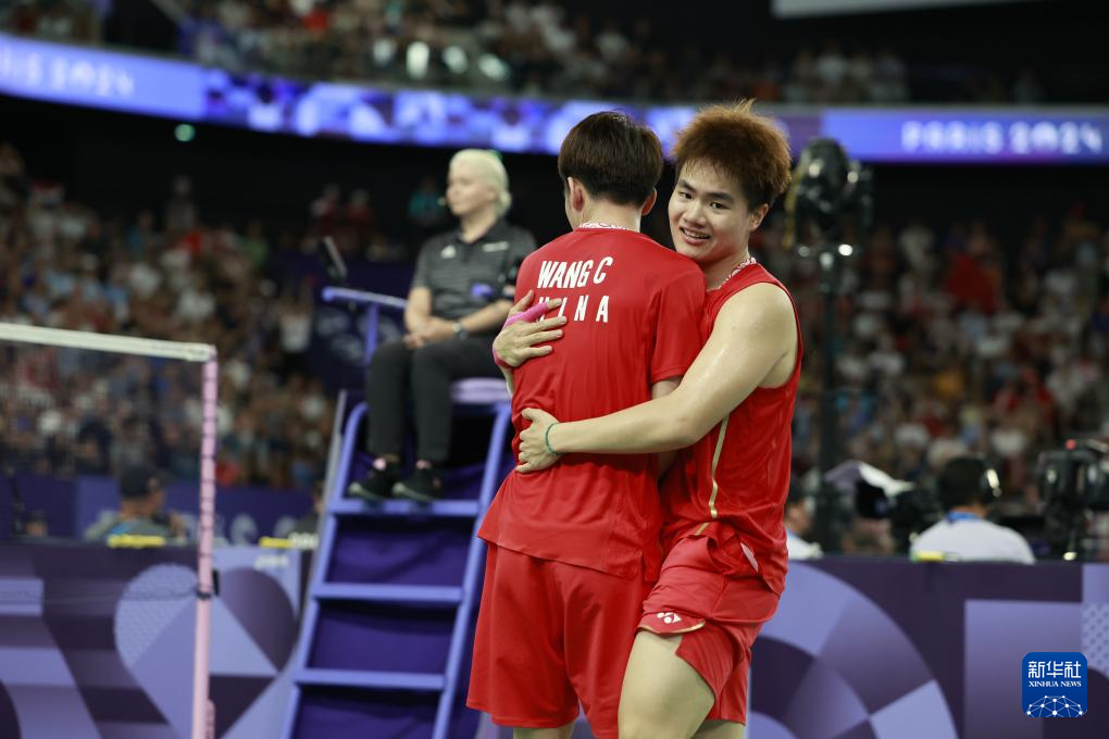 8月1日,中国组合梁伟铿(右)/王昶在比赛中庆祝得分。新华社记者 陈斌 摄