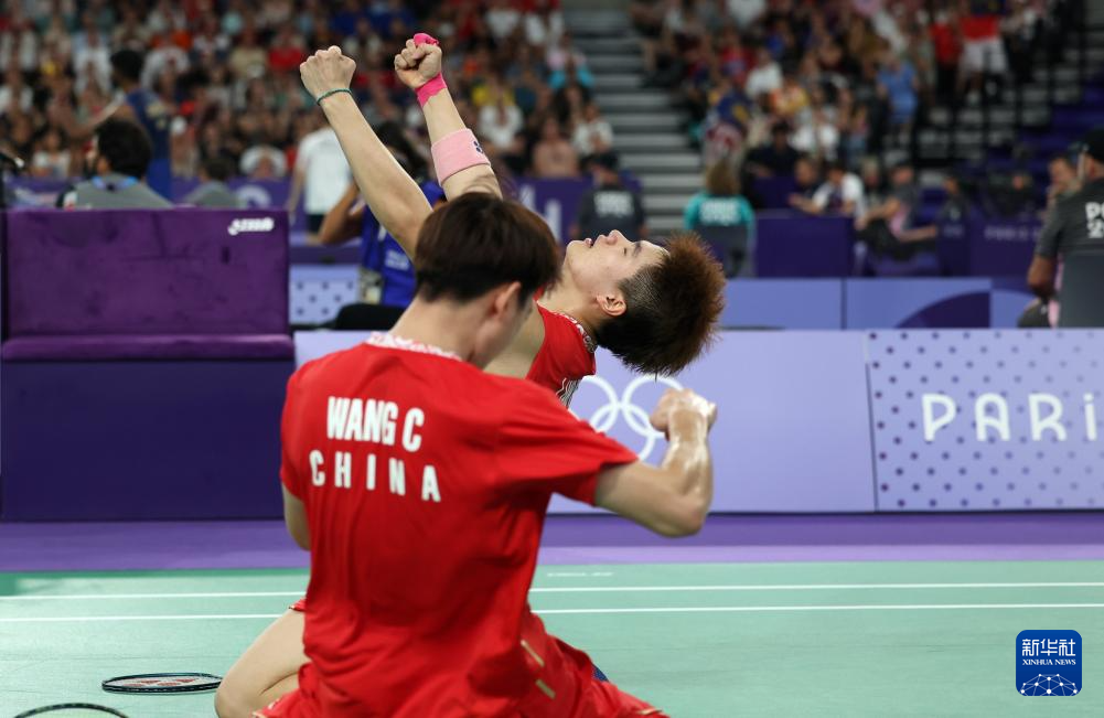 8月1日,中国组合梁伟铿(左)/王昶在比赛中庆祝得分。新华社记者 陈斌 摄
