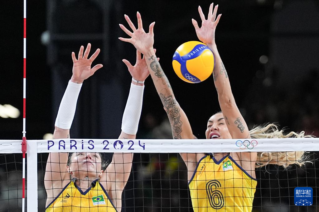 8月1日,巴西队球员泰莎·梅内塞斯(右)在比赛中拦网。新华社记者 鞠焕宗 摄