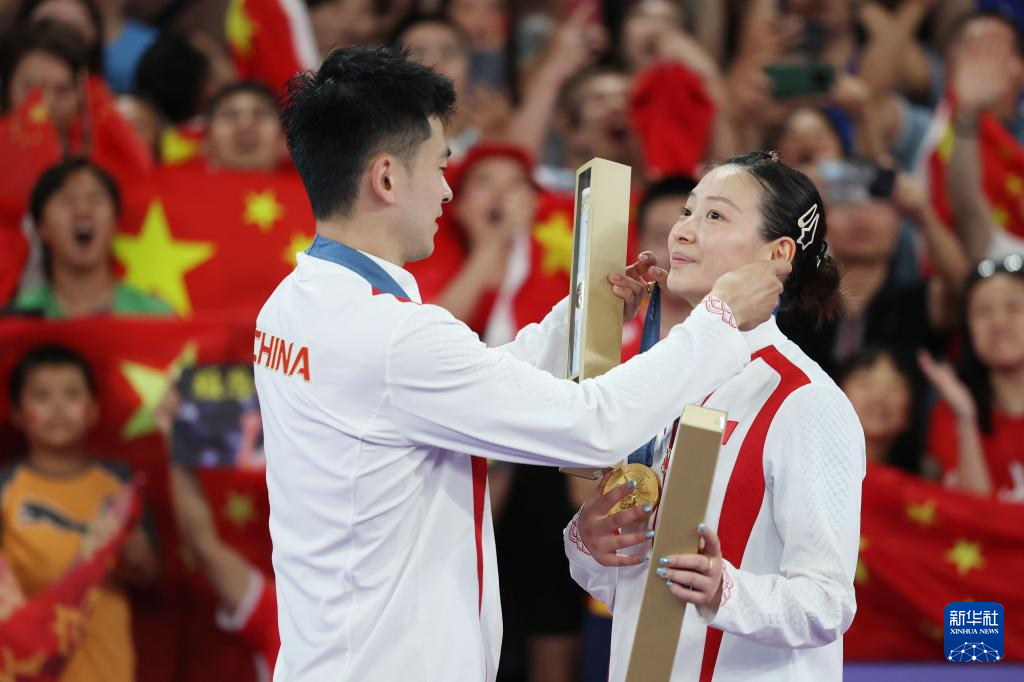 8月2日,黄雅琼(右)在颁奖仪式上给队友郑思维戴上金牌。