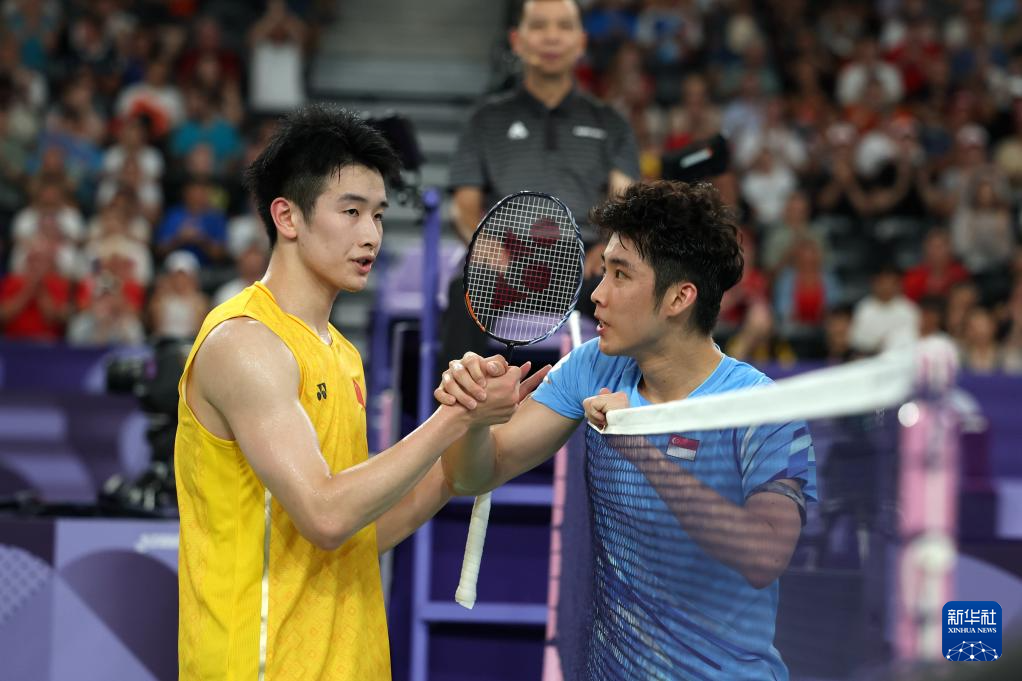 8月1日,中国选手李诗沣(左)与新加坡选手骆建佑在比赛后相互致意。新华社记者 陈斌 摄