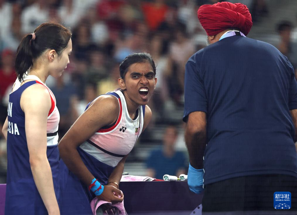 8月2日,马来西亚选手蒂娜(中)在比赛间隙接受治疗。新华社记者 贾浩成 摄