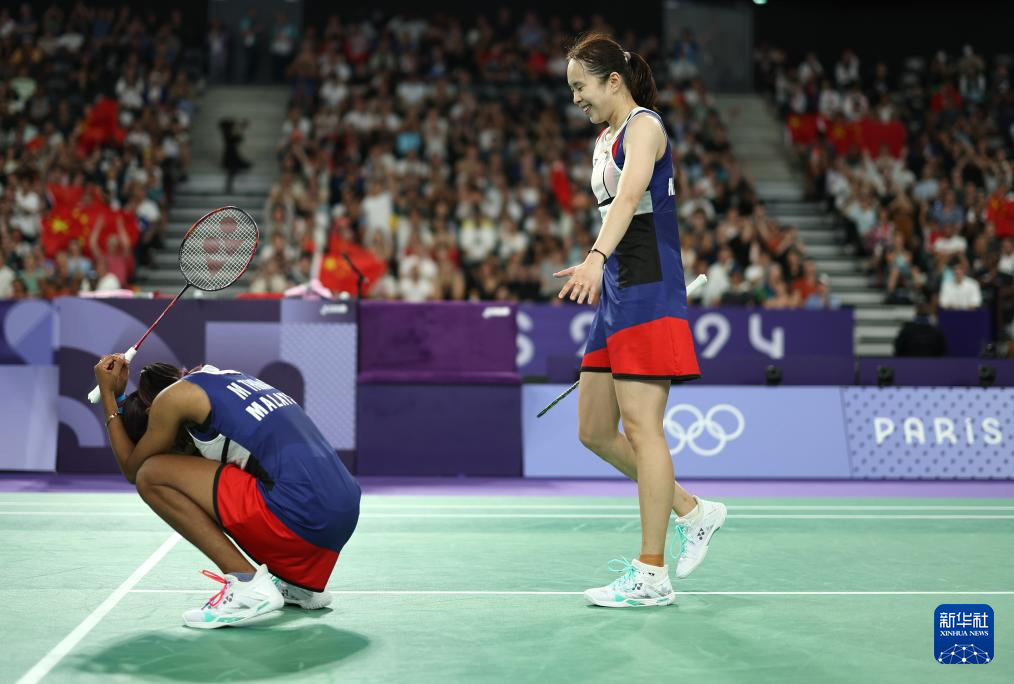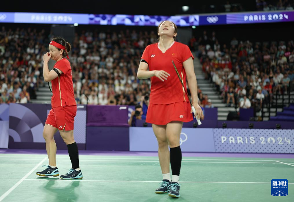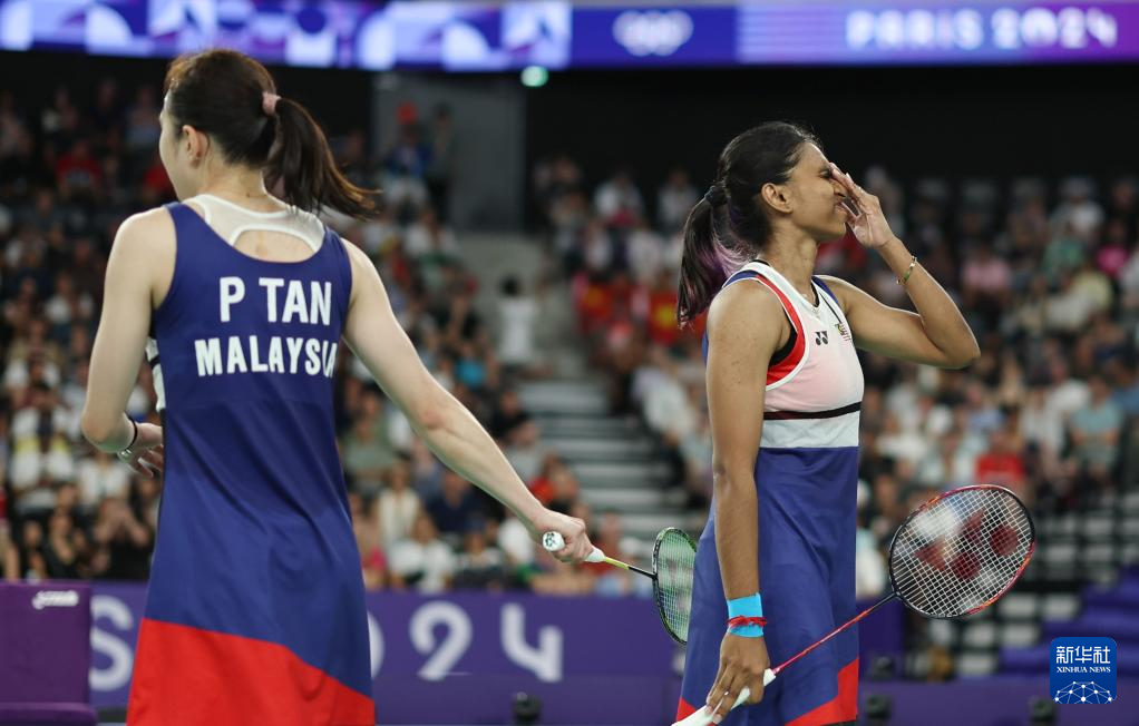 8月2日,马来西亚组合陈康乐(右)/蒂娜在比赛中失分后。新华社记者 贾浩成 摄