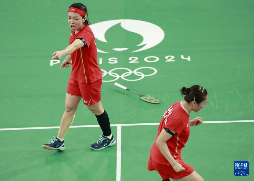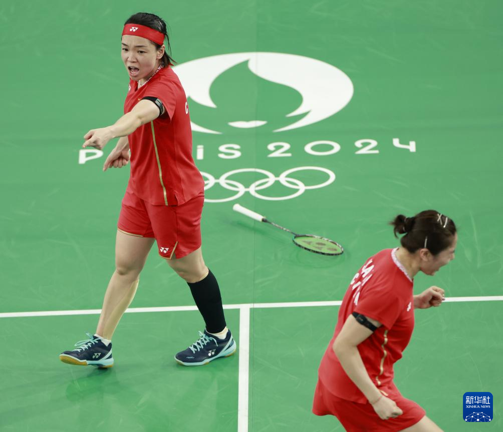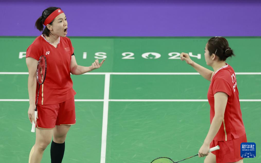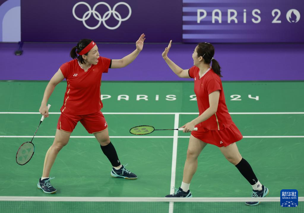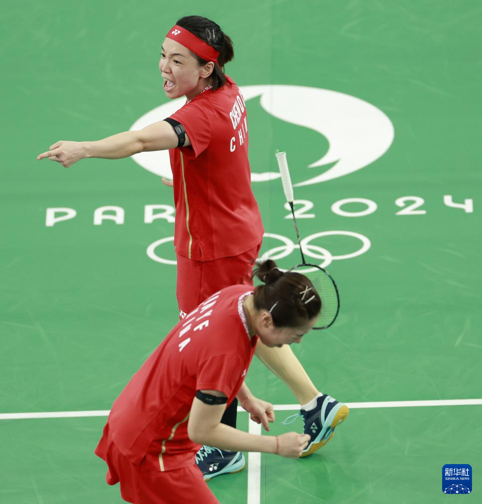 8月2日,中国组合陈清晨(左)/贾一凡在比赛中庆祝得分。新华社记者 任正来 摄