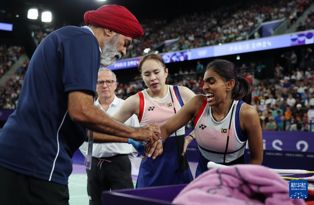 8月2日,马来西亚选手蒂娜(右一)在比赛中受伤接受治疗。新华社记者 陈斌 摄