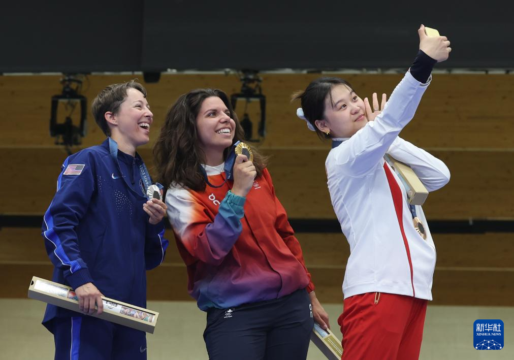 8月2日,冠军瑞士选手莱罗内(中)、亚军美国选手马达莱娜(左)、季军中国选手张琼月在颁奖仪式后合影。新华社记者 赵丁喆 摄