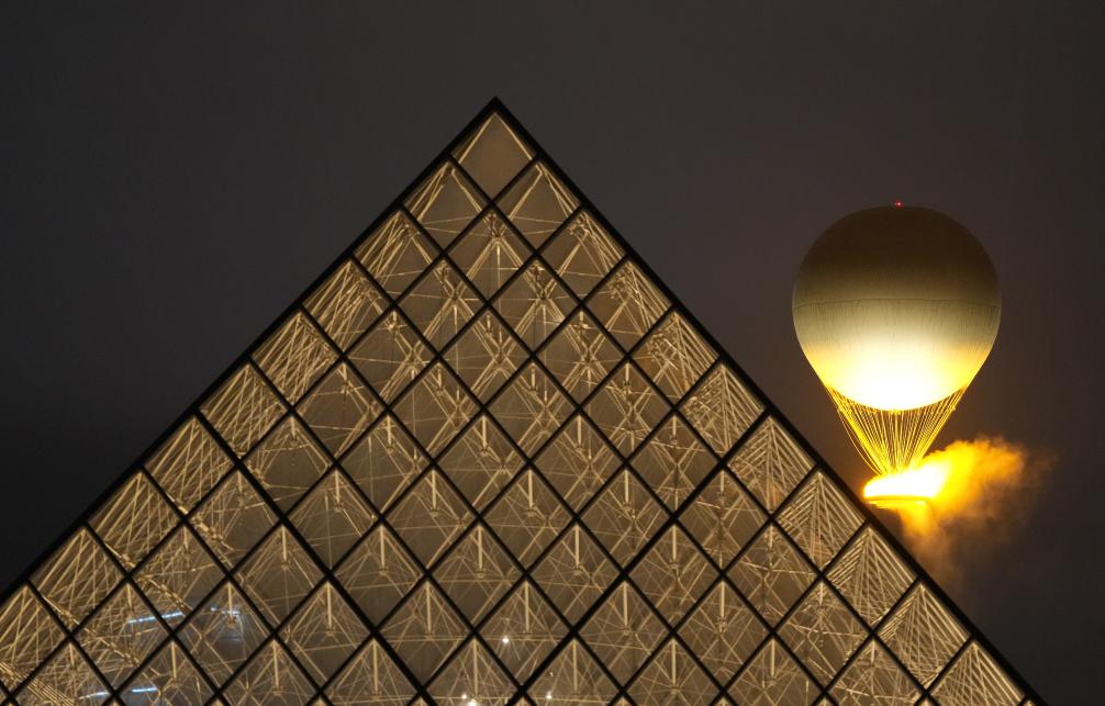 7月26日,热气球状的主火炬在卢浮宫的玻璃金字塔前点燃。新华社记者孙非摄