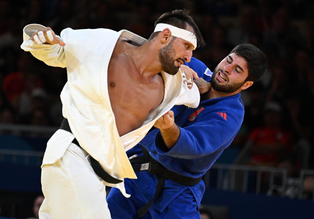 8月1日,阿塞拜疆选手科佐耶夫(左)与格鲁吉亚选手苏拉马尼泽在比赛中。新华社记者 李安 摄