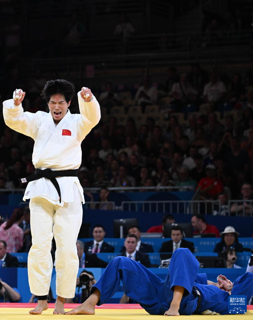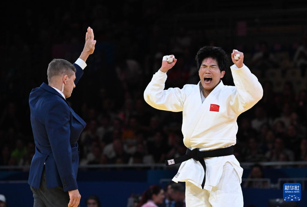 8月1日,中国选手马振昭在战胜德国选手安娜-玛利亚·瓦格纳后庆祝。新华社记者 武巍 摄