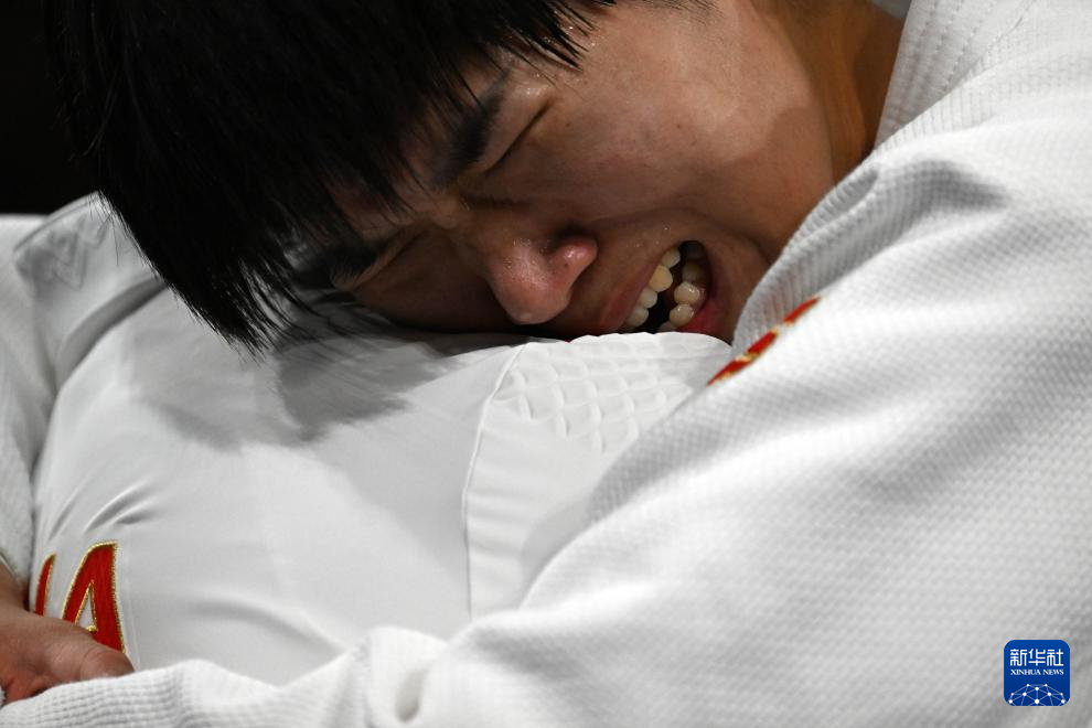 8月1日,中国选手马振昭在比赛后拥抱教练。新华社记者 李安 摄