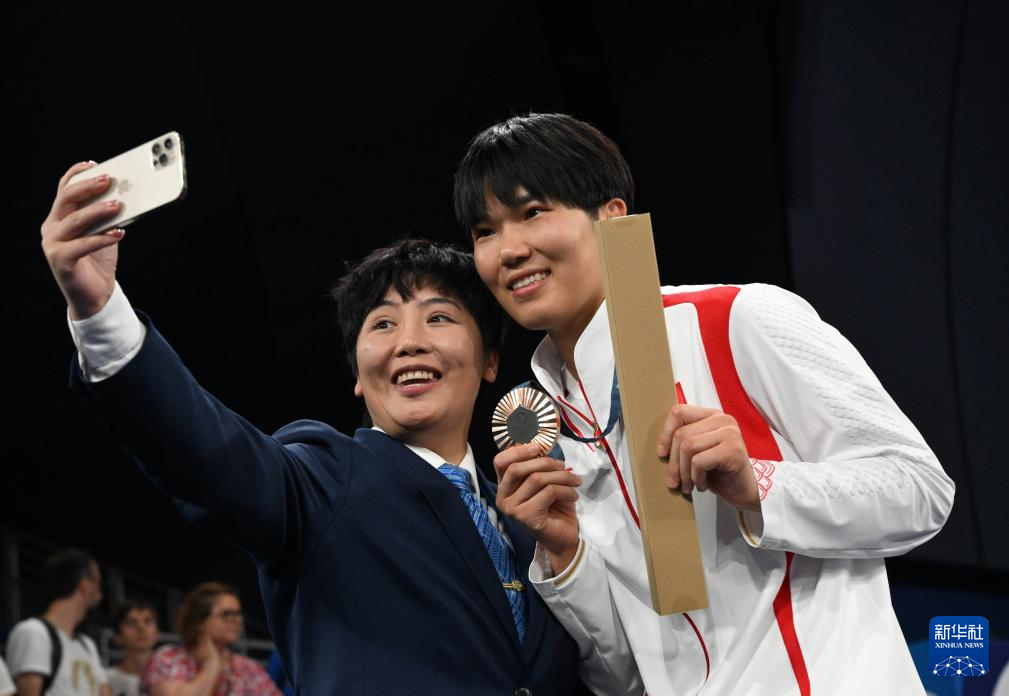8月1日,中国选手马振昭(右)在颁奖仪式后与中国裁判张光玥自拍。新华社记者 李安 摄