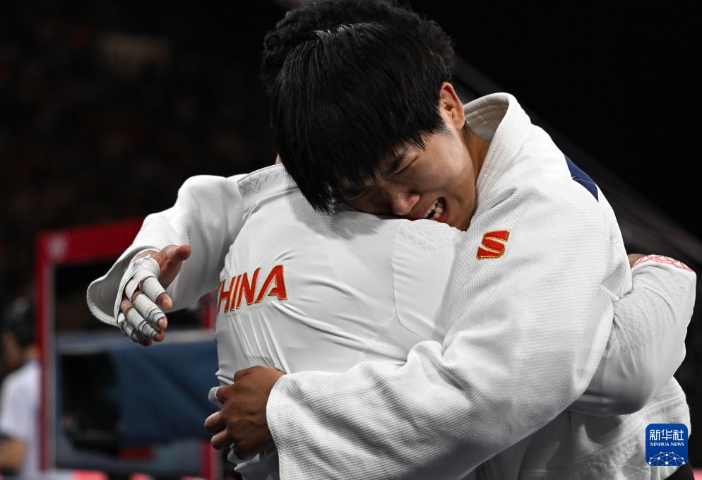 8月1日,中国选手马振昭(右)在赛后拥抱教练。新华社记者 李安 摄