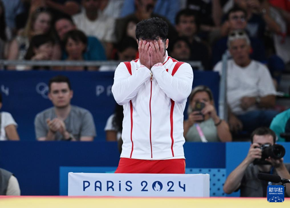 8月1日,教练在中国选手马振昭获胜后掩面而泣。新华社记者 武巍 摄