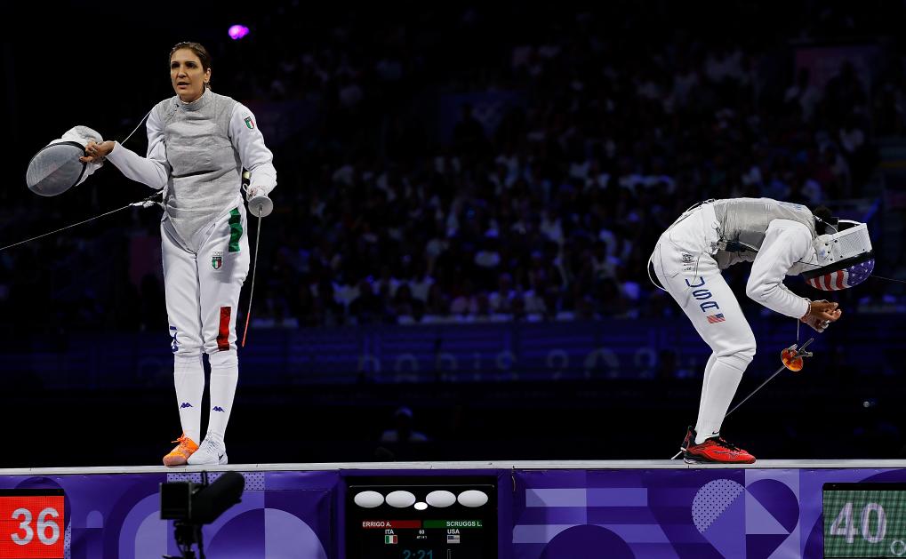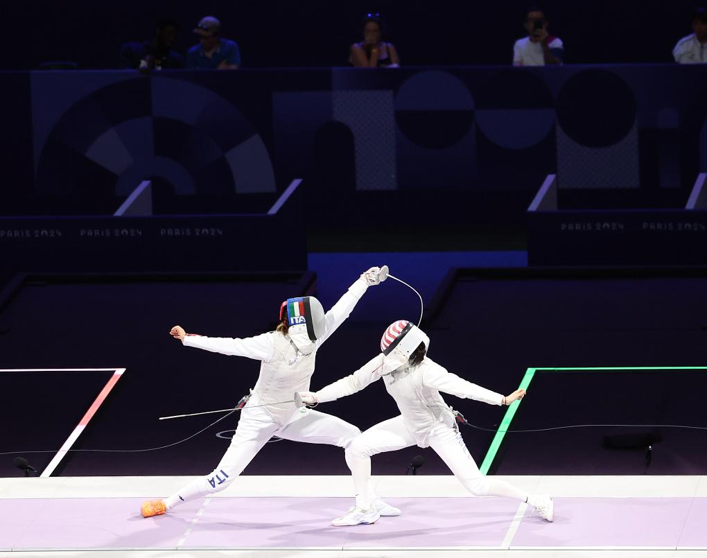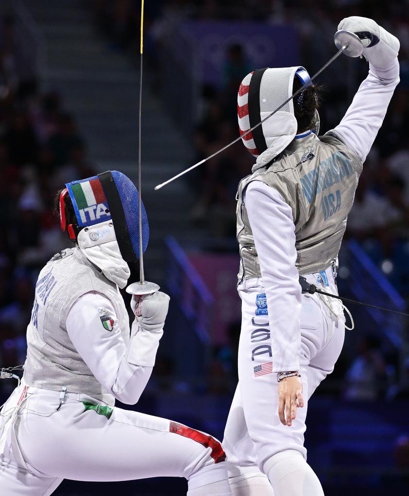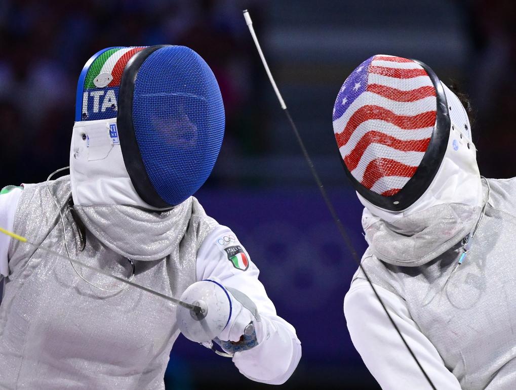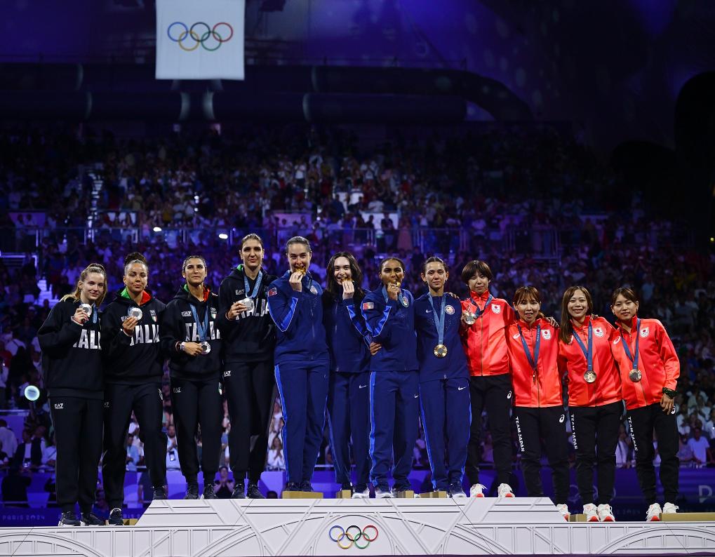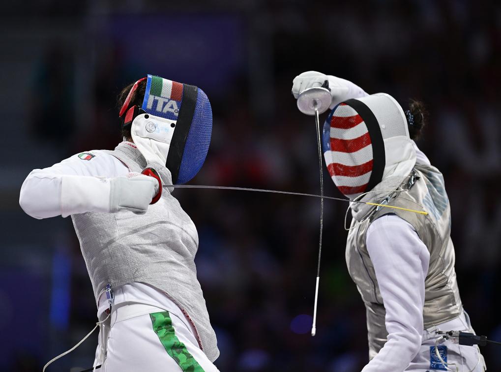 当日,在巴黎奥运会击剑项目女子团体花剑金牌赛中,美国队45比39战胜意大利队,获得冠军。